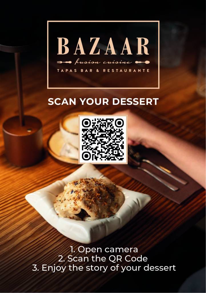 Dessert Menu (Table Display) – placed on tables as stylish stands after the main course. Guests scanned the QR code to watch videos of desserts being prepared, encouraging them to order more.Project Goal: