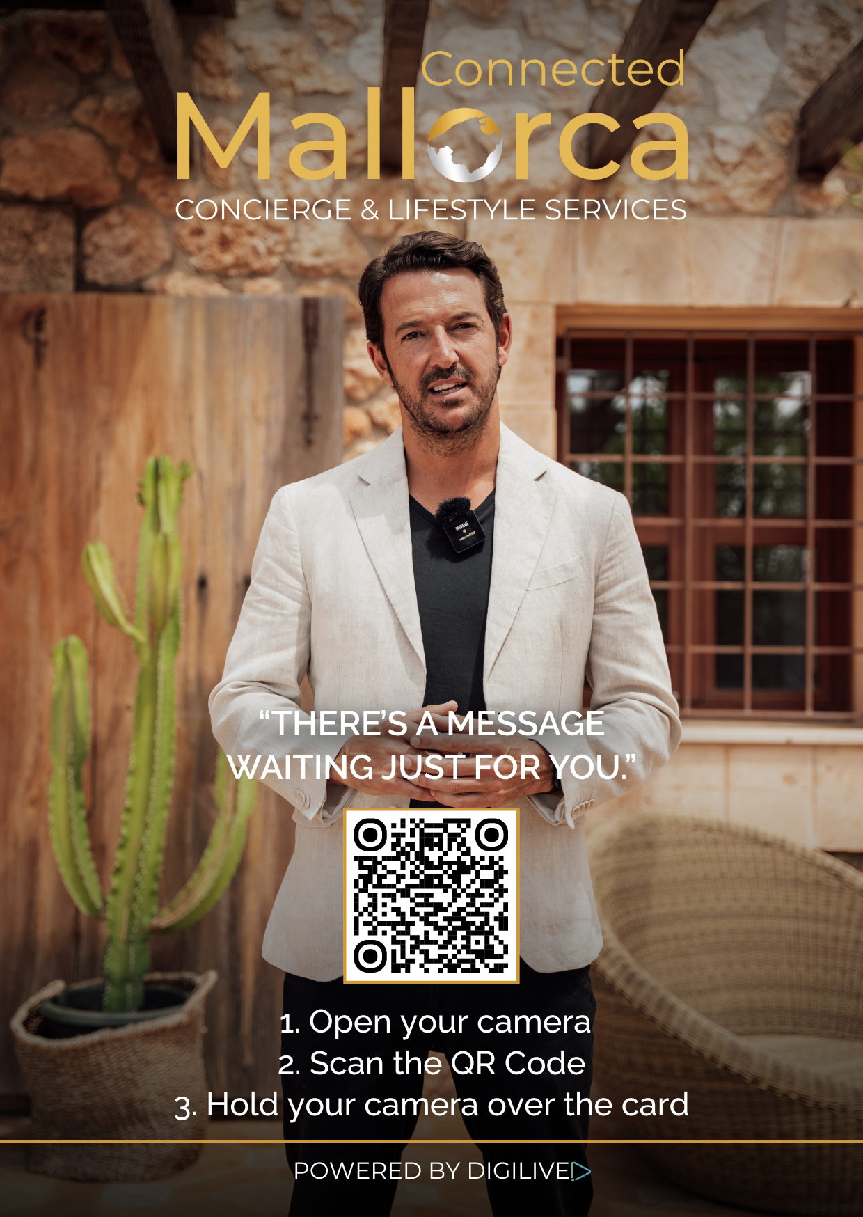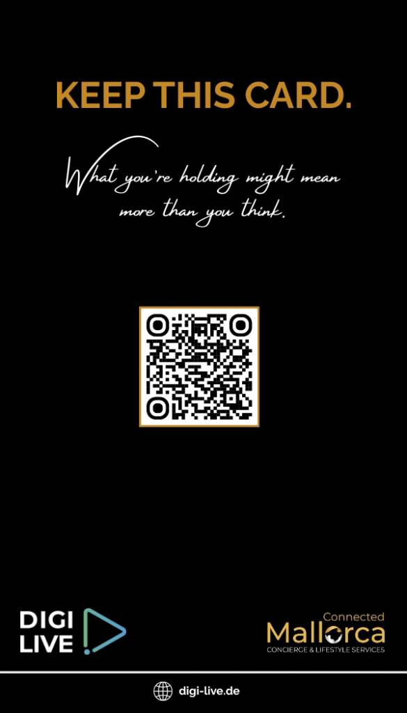 Visuals of the DigiLive giveaway card, table card, and event poster designed for Shane’s Connected Mallorca event. Each item integrated QR codes leading to unique video experiences.
